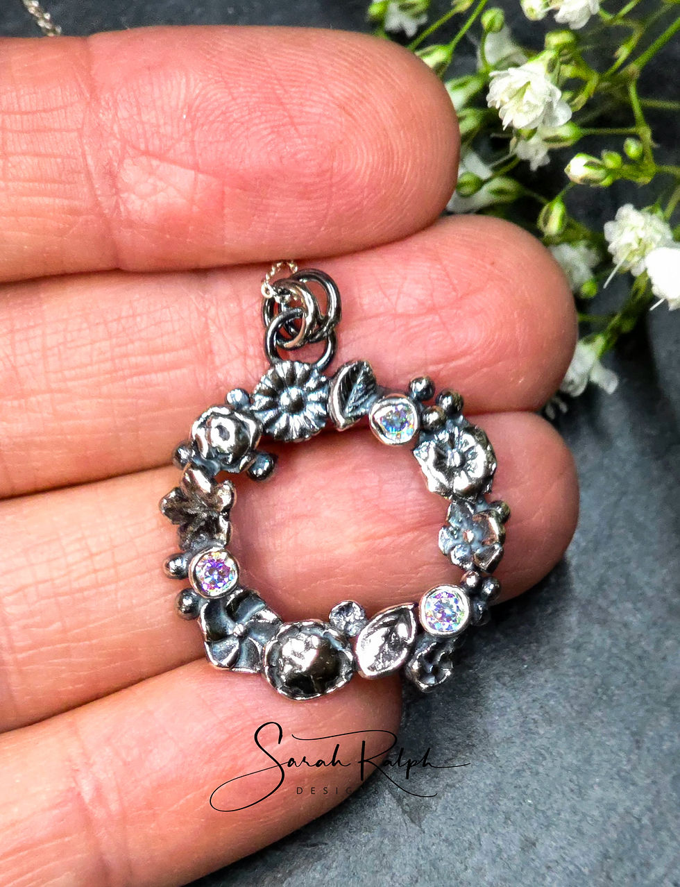 Round Chelsea Pendant with Flowers and Leaves with Aurora Stones